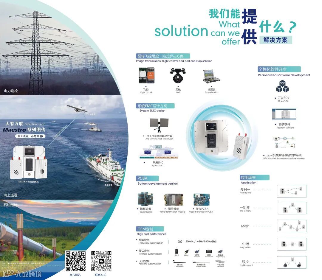 大有万联(深圳)科技有限公司是行业领先的国家高新技术企业,自成立以来一直专注于无线视频与数据传输细分市场的产品研发、生产和销售,所研发的无人机无线图传产品达到行业领先水平,并在无人机、机器人、应急通信、边防监控等领域批量应用,产品获得工信部型号核准、CE、FCC等认证,远销海内外市场。从2016年就研制出了第一代COFDM无线高清图传Skywalker系列S1,与行业内多家工业级无人机公司达成合作并长期供货;2017年开发了与DJI Naza、A2等飞控兼容的无线数传电台Datalink,第一代无人机图数一体电台研制成功;2018年多路视频同传的图传S2研制成功,低延时编码系统研制成功,达到行业先进水平;2019年第二代图数控一体Maestro多个型号研发成功,M50、M51先后通过工信部型号核准和CE、ROHS认证,同时30km图数控一体图传M52研制成功;2021年,M52通过CE、ROHS认证并实现批量出货,成功研发了超远距离无人机数据链系统M58;2022年,公司推出了系列新品MK22和MK55,实现图传和天线一体化;2023年,实现了M58和M58 pro的批量生产。