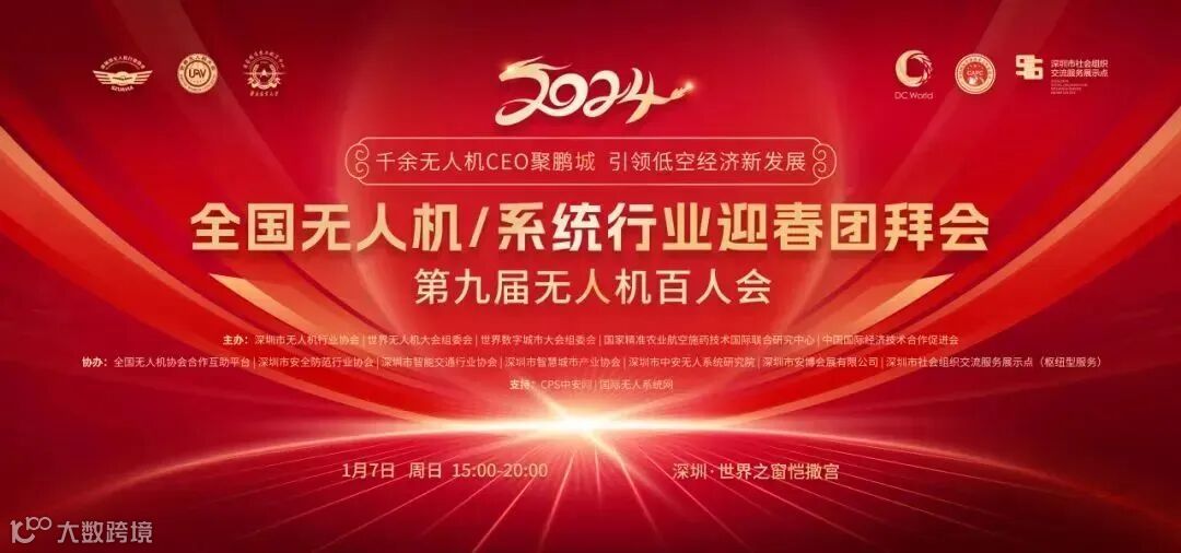 2024年1月7日,由深圳市无人机行业协会、世界无人机大会组委会、世界数字城市大会组委会、国家精准农业航空施药技术国际联合研究中心、中国国际经济技术合作促进会、粤港澳大湾区低空经济研究院主办,吉林化纤集团、共青城市南湖新城管理委员会协办的“2024全国无人机/无人系统行业迎春团拜会暨第九届无人机百人会”在深圳市世界之窗恺撒宫成功举办。
