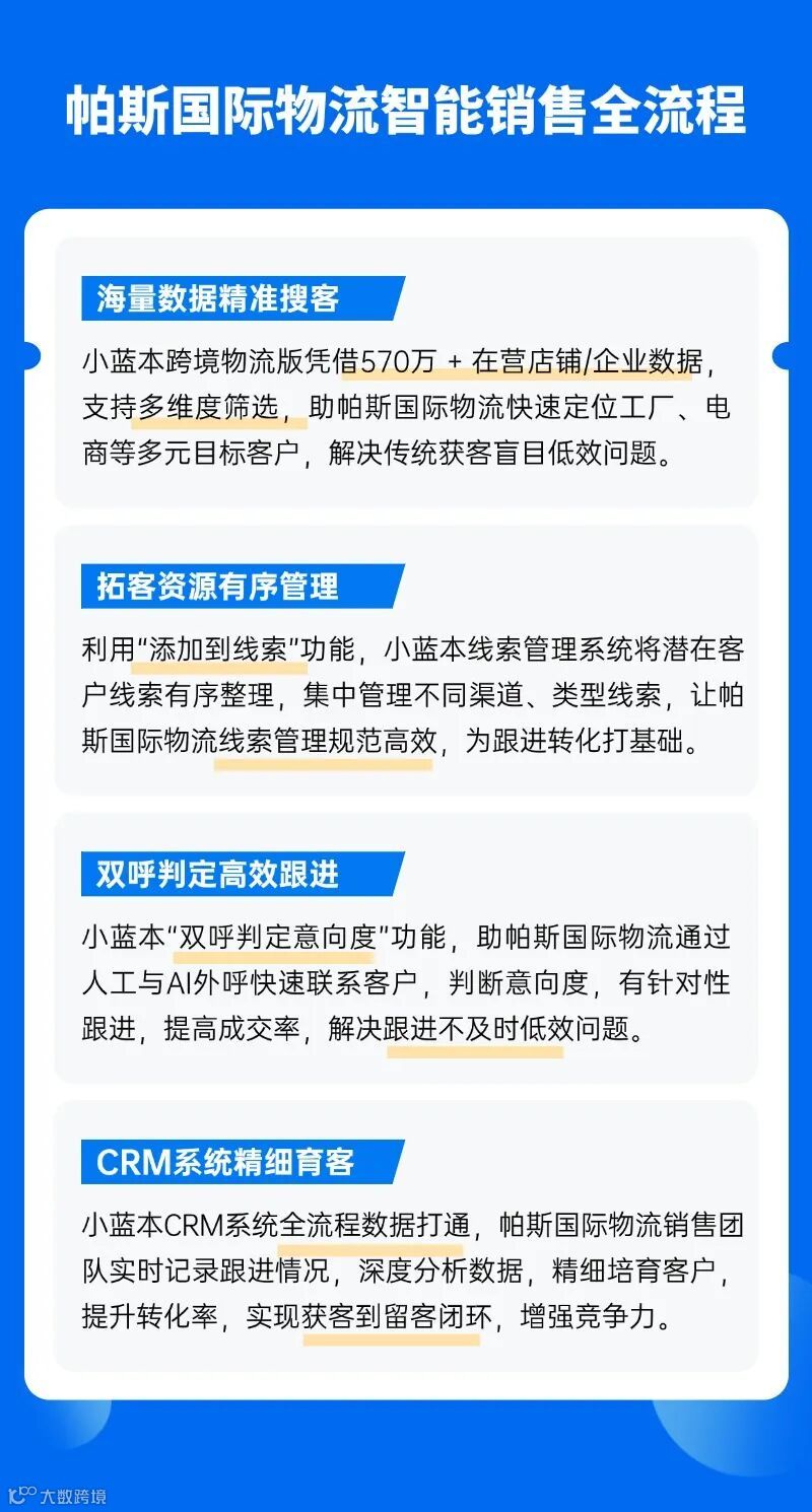 帕斯国际物流敏锐洞察到,要在竞争白热化的赛道中突围,必须打破传统拓客的窠臼。他们深知,唯有通过数字化手段才能实现突破。他们通过优化内部流程和提升服务质量,努力为客户创造更大价值,但获客方式始终制约着业务扩展的步伐。为了服务更多客户,开拓更广阔的市场,帕斯国际物流急需寻找破局之法。小蓝本跨境物流版凭借强大的数据能力和智能拓客工具,不仅能精准定位客户,还能实现客户线索的精细化管理,正好契合了 帕斯国际物流的需求,双方一拍即合,开启合作之旅。