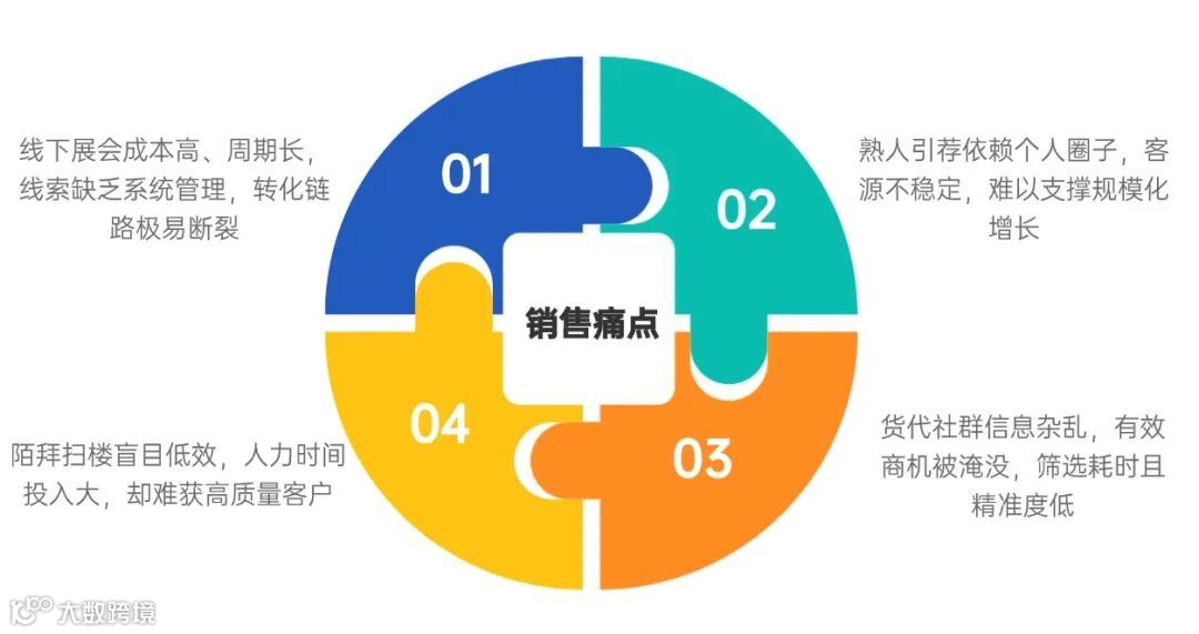 跨境物流行业普遍依赖线下展会、熟人引荐、货代社群、陌拜扫楼四种获客方式,线下展会不仅场地、差旅成本高昂,且受时间周期限制,展会后大量线索缺乏系统管理易流失,转化链路断裂;熟人引荐受个人社交圈局限,客源增量不稳定,难以支撑企业规模化扩张需求,制约业务增长边界;货代社群内信息杂乱无章,无效广告与冗余信息泛滥,有效商机被层层覆盖,筛选优质客户需耗费大量时间精力,精准度大打折扣;陌拜扫楼无明确目标导向,仅凭地域分散走访,常面临闭门羹,人力与时间成本持续攀升,却难以收获对等成效,行业整体深陷传统获客困境。