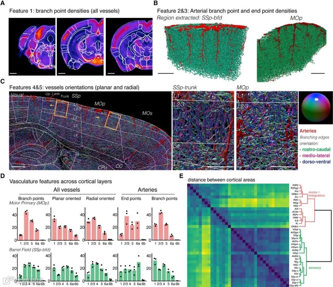 研究人员将包括拓扑在内的各个方面纳入分析。确定了所有血管分裂或连接的分支点。典型的血管图由每个半球320万个分支点和440万个血管段组成。全脑平均血管分支点密度为6,400/mm3。