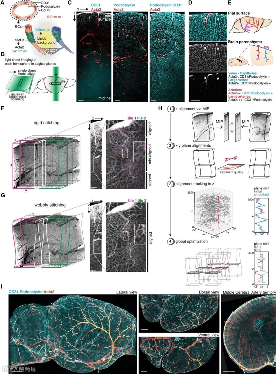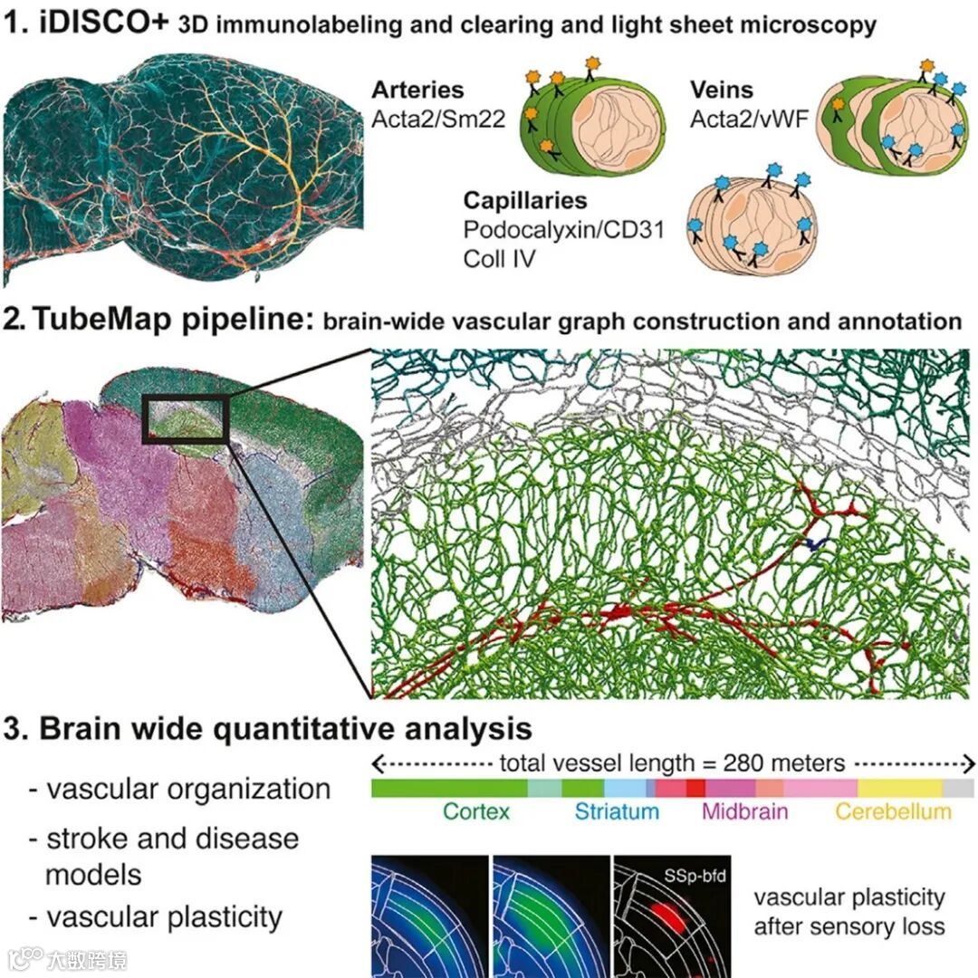结果:针对CD31、podocalyxin和Acta2的互补免疫标记使研究团队能够对完整灌注脑内的血管进行深度免疫标记。