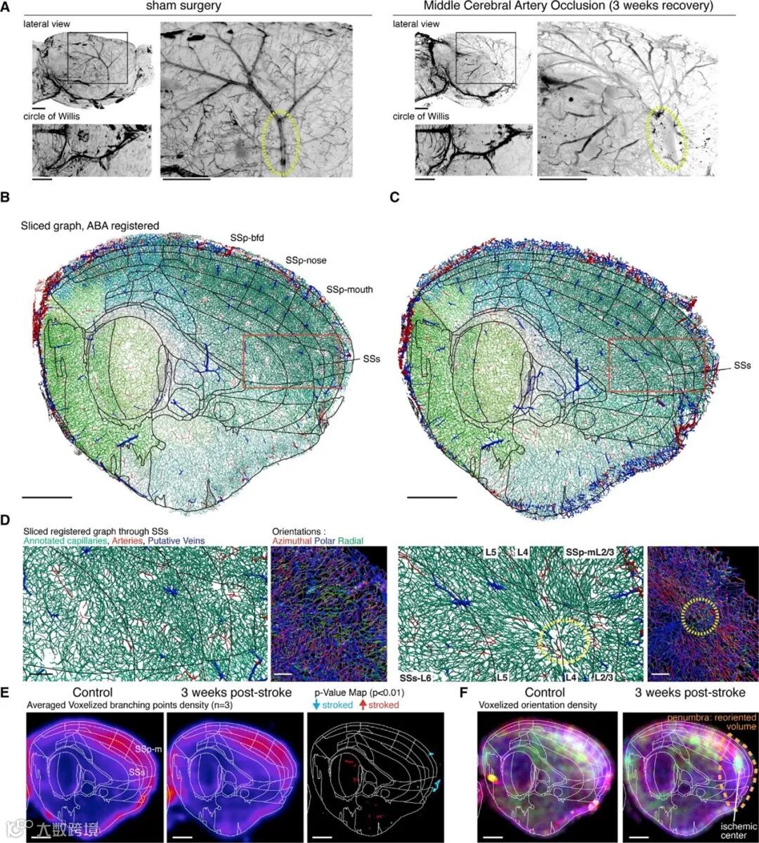 研究人员以成年小鼠的缺血性中风模型为研究对象,观察了中风后3周血管网络的长期变化。中风是通过电凝固闭锁大脑中动脉诱发的,这种操作会在背外侧皮层引起局部缺血。为了避免损伤可能脆弱的血管,研究者使用了固定后的脑组织,并对这些脑组织进行了podocalyxin、Acta2和小鼠免疫球蛋白的染色处理。