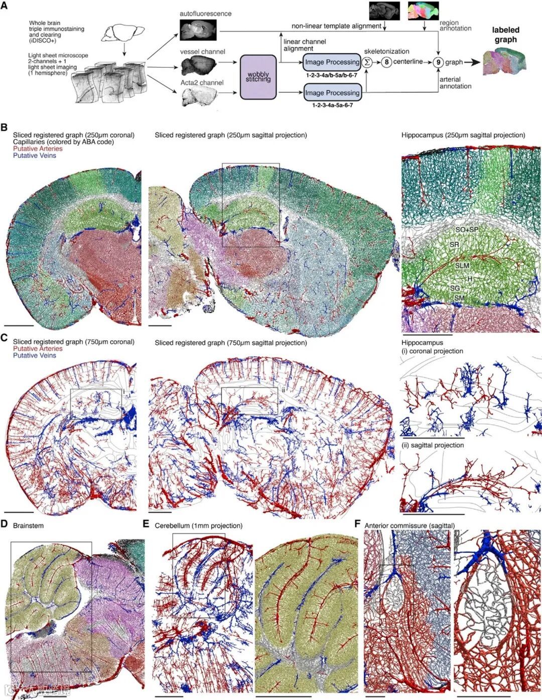 大脑血管网络由动脉、毛细血管和静脉组成,对于满足大脑的高代谢需求至关重要。由于大脑储存能量的能力较低,神经功能与血管功能密切相关。血流的微小变化可能影响神经功能,甚至危及神经元的存活。反之,神经活动也会影响血流动力学。然而,大脑血管网络跨越多个空间尺度,形成高度复杂的网络,且与大脑的物质交换由血脑屏障严格控制。传统的研究方法难以提取大脑范围内的血管组织信息。