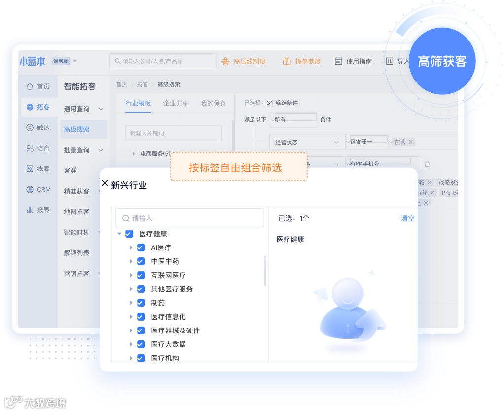 对开发新客户需求大,需借助系统高效开拓优质客源。批量挖掘医药行业有医药 SaaS 服务的优质企业客户,精准触达企业决策人(KP),促进销售主动挖掘业务,提高业务效率!