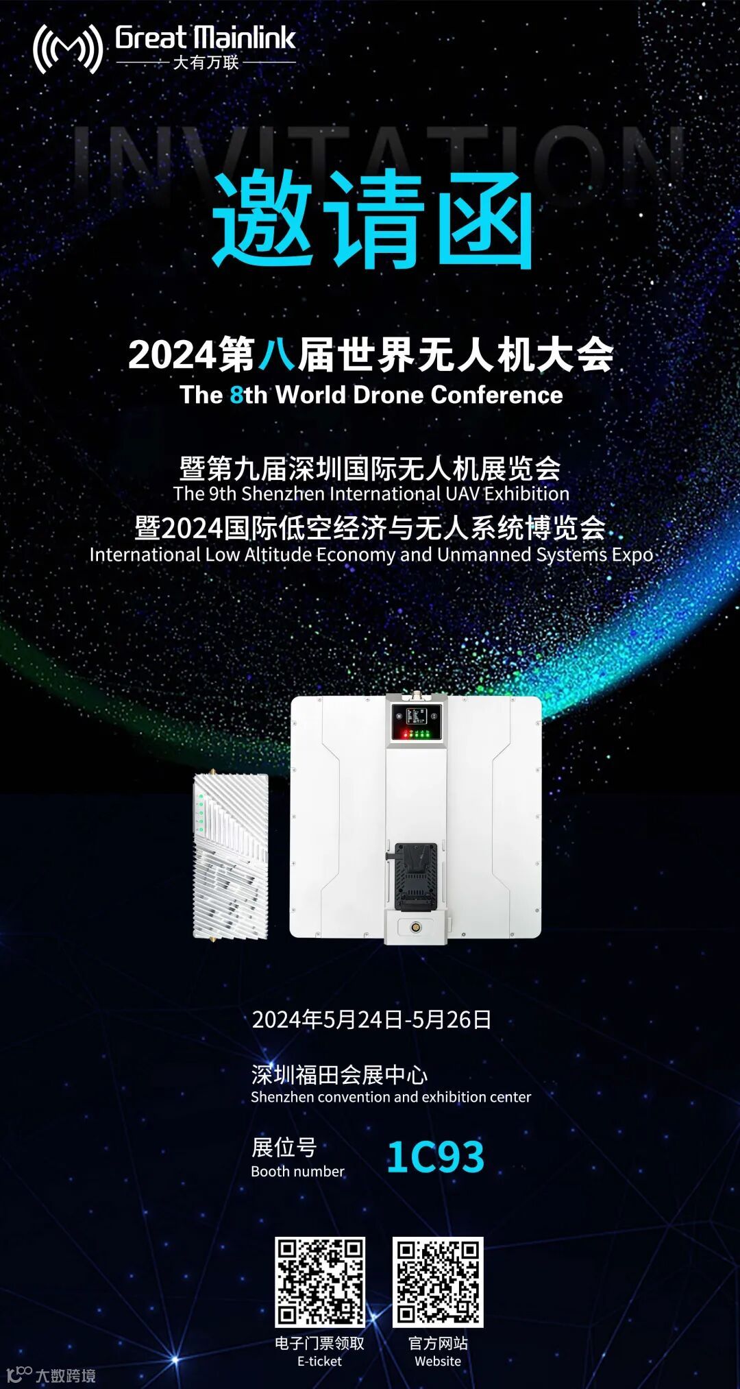 2024 第八届世界无人机大会暨第九届深圳国际无人机展览会”将于5月24日-26日在深圳福田会展中心举行,届时将有 400 余家无人机企业参展,展出面积30000多平方米。大有万联作为领先的无线图传产品提供商,已连续多年参展,本次的展位号为:1号馆1C93,届时欢迎各位莅临参观指导。(扫描下方二维码可领取电子门票)
