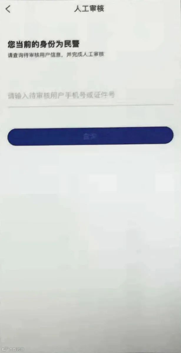 对于每一个开通了“警员端”权限的民警,均有审核权限。民警进入APP警员端,点击“人工审核”,输入提交审核人员的身份证号或手机号,对其进行审核,审核完成该人即完成实名认证