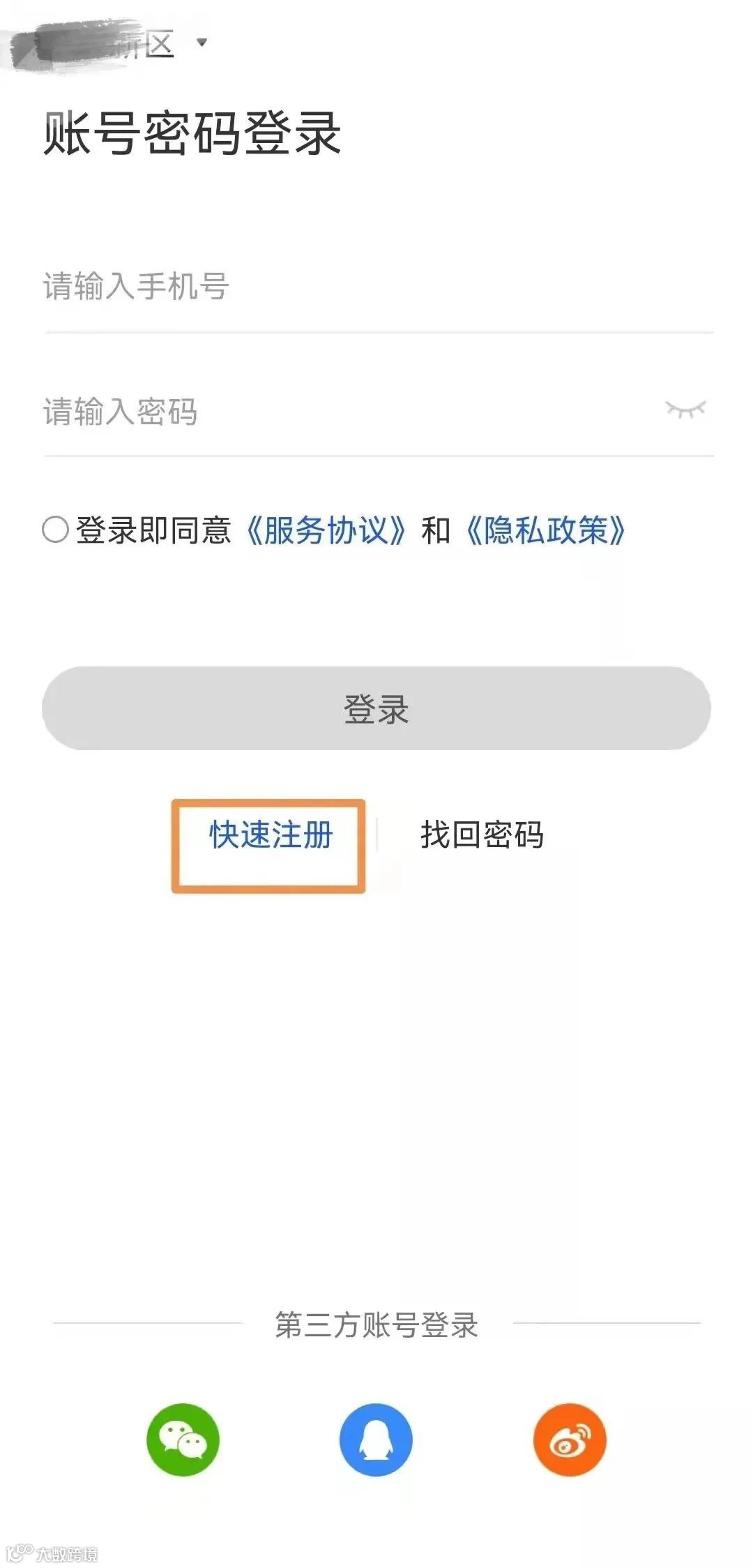 下载完成后打开APP,选择常驻地区,点击“快速注册”,输入手机号码,点击“获取验证码”,输入验证码、设置密码,点击“下步”完成注册。输入注册的账号和密码,点击“登录”进入。