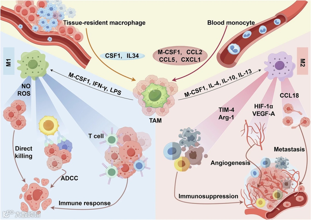 TAMs主要来源于循环中的单核细胞,在CCL2、CSF-1等趋化因子作用下被招募至肿瘤部位。其功能状态受肿瘤微环境信号的动态调控,形成一系列功能连续体。经典的二分法将其划分为: