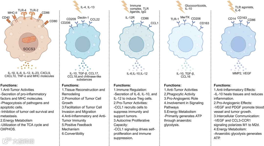 (1)M1型:由IFN-γ和LPS等信号诱导,高表达iNOS,分泌IL-12、TNF-α、CXCL9/10等促炎因子,具有强大的抗原提呈能力和直接肿瘤细胞杀伤作用,是抗肿瘤免疫的效应细胞。