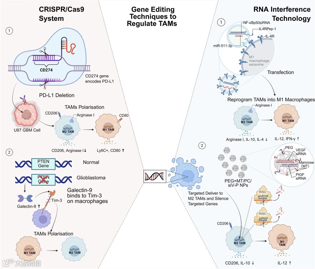 (3) 基因工程改造:利用CRISPR-Cas9或siRNA纳米颗粒在TAMs中敲低/敲除促瘤基因(如PI3Kγ、CCR2),或过表达免疫刺激因子,实现精准的基因层面功能重塑。