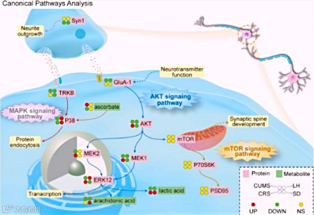 通过慢性不可预测的轻度应激、习得性无助应激、慢性约束应激和社会失败应激这4种经过充分验证的大鼠应激模型,研究大鼠抑郁样行为。并结合蛋白质组学和代谢组学来研究这四个模型海马体的分子变化,揭示了百余种蛋白质和代谢物发生的变化。通过IPA和KEGG分析,鉴定出差异调控的经典通路,提出了模拟AKT和MAPK信号通路网络及其相互作用的模型,并揭示了其级联反应。此外,通过Western Blot证实了p-AKT、p-ERK12、p-MEK1、p-MEK2、p-P38等,它们至少在一种模型中发生了变化。重要的是,p-AKT、p-ERK2、p-MEK1 和p-P38 被确定为四种模型中发生的常见改变。四种抑郁模型之间,不同压力源引起的分子水平变化可能存在巨大差异,甚至相反。然而,不同的分子改变都汇聚在共同的AKT 和MAPK 分子途径上。