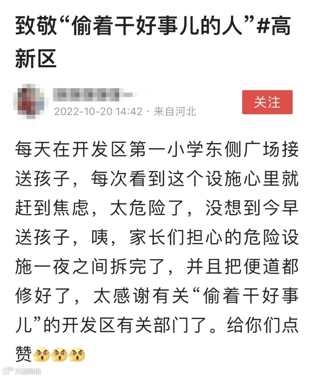 事后,一位家长在网上发布了一篇名为“致敬‘偷着干好事儿的人’#高新区”的网贴,用朴实的语言表达了对高新区此项工作的感激之情,也引起了众多网友的点赞留言。