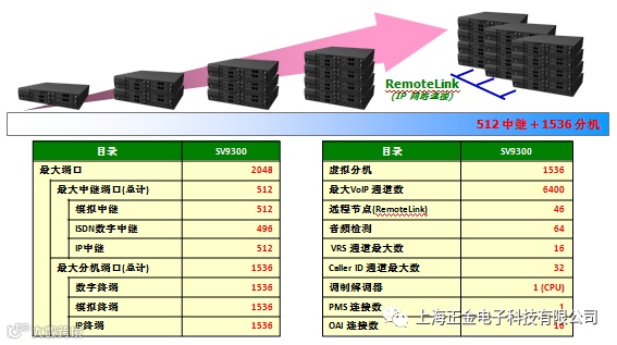 一个19英寸机柜可容纳总共108个传统TDM端口(96个数字终端)。为了扩展,一个单元系统可以增加到3个19英寸机柜,最大324个传统TDM端口(288个数字终端)。通过IP连接,再增加多个19英寸机柜,SV9300系统最大可扩展为2048个端口。