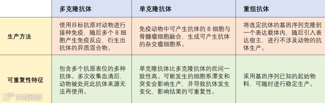 表 1. 多克隆抗体、单克隆抗体与重组抗体的生产方式与可重复性比较。
