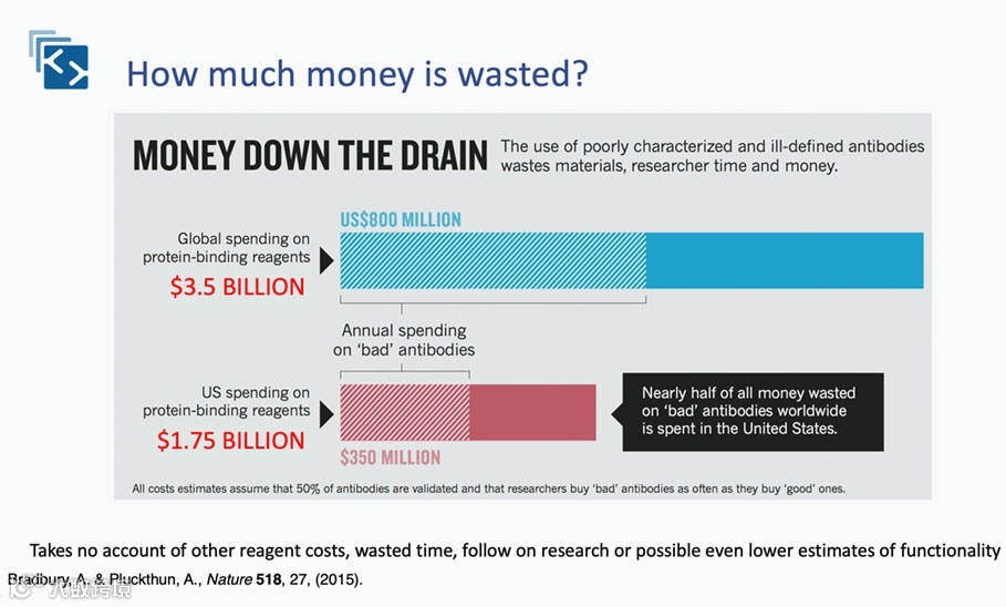 使用特征不明确的抗体试剂则可能会导致了虚假或误导性结果的发表,《自然》杂志对 1,576 名研究人员进行的一项调查显示,70% 以上的研究人员无法重复其他科学家的实验1。科研人员很多时候工作是在先前研究的基础上进行,这种不可重复性会导致巨量的时间和资金被浪费;Andrew Bradbury 在 2015 年发表的论文中预计,全球在表征不良的抗体上花费的费用达 16 亿美元2。但是,自这篇论文撰写至今,这一预计数字增长了不止一倍,达到 35 亿美元3。例如有15 篇关于阿尔兹海默症相关蛋白 C9ORF72 的论文引用了一篇关于C9ORF72 抗体的研究,该研究后续被证实其使用的C9ORF72抗体无法特异性识别C9ORF72蛋白,所有的这些论文后续产生了 3500 次一级引用和 66000 次二级引用4。