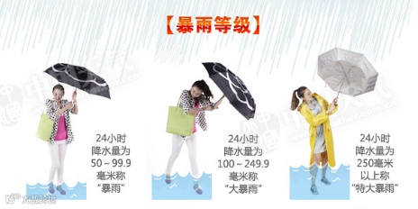 暴雨:24小时降雨量达50毫米或以上的降雨称为暴雨。