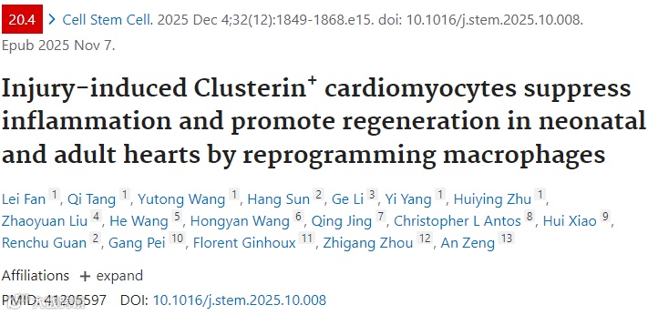 本文利用人胚胎干细胞构建心脏类器官,并通过小分子筛选发现丙戊酸(VPA)可高效诱导其中表达Clusterin(CLU)的心肌细胞,形成CLU⁺人源心脏类器官。这些类器官在心肌梗死后被移植至小鼠梗死边缘区,能显著增强心肌细胞增殖,减少纤维化,并改善心功能。相比普通心脏类器官,CLU⁺类器官在移植后促进抗炎型巨噬细胞(GPNMB⁺/ARG1⁺)聚集,重建再生微环境,表现出更强的修复潜力。该策略不仅验证了CLU在心脏再生中的关键作用,也为临床心肌梗死治疗提供了一种可移植、可规模化生产的类器官干预新范式。