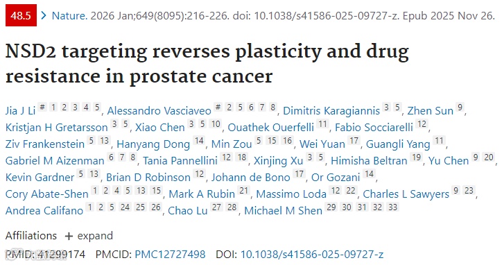 该研究通过建立基因工程小鼠(NPp53)来源的21个前列腺癌类器官系(其中6个具有神经内分泌特征)和多个人类患者来源类器官模型(涵盖CRPC-NE、CRPC-WNT和CRPC-AR亚型),系统研究了谱系可塑性在神经内分泌型去势抵抗性前列腺癌(CRPC-NE)中的作用机制。利用单细胞RNA测序和谱系追踪技术,研究证实NSD2介导的H3K36me2组蛋白修饰是维持神经内分泌表型的关键表观遗传驱动因素。通过CRISPR敲除NSD2或药理学抑制(NSD2i),可在类器官中逆转神经内分泌分化、恢复雄激素受体(AR)表达和经典AR信号通路活性,并使耐药肿瘤重新对恩杂鲁胺敏感。体内外实验表明,NSD2i与恩杂鲁胺联用对多种CRPC亚型类器官及异种移植瘤具有协同抗肿瘤效应,为治疗致死性前列腺癌提供了基于逆转谱系可塑性的新策略。