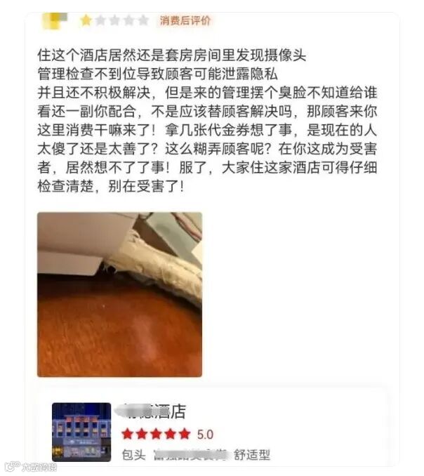 ·案例1(包头): 情侣发现摄像头,酒店仅愿赔偿代金券,住客差评反被起诉。