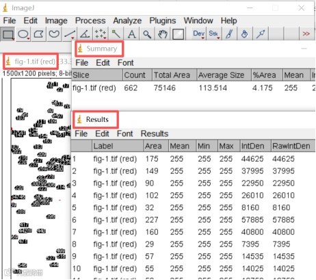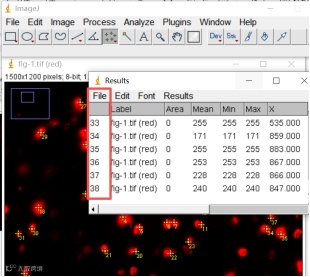 运行后得到一张各信号点标记序号的图像,“Results”是每个计数点的详细信息,“Summary”是计数后的总数据,导出表格进行分析。