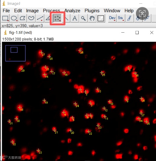 对于信号比较密集或模糊,阈值处理后信号成团不便自动计数的图像,可在步骤1后直接单击Point,手动标记每一个细胞信号进行计数,每个点在图像上都呈现出对应的序号。
