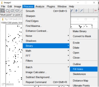 点击Process→Binary→Fill Holes将信号点补充为完整的细胞(若荧光信号饱满填充细胞没有空腔,可省略此步骤)。