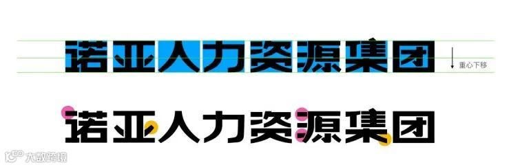 诺亚人力资源集团的字体由原竖型的字体变成了较宽的字体,降低了字体的重心,如此使字体看起来更加稳健、厚重。字体的笔画经过了特别的设计,将字体中的“点”的笔画变成了横线,增加字体的庄重、沉稳、规矩感。