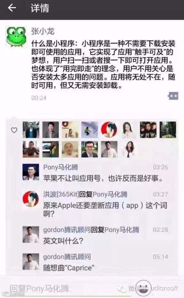 就在微信应用号(小程序)开始内测的时候,微信之父张小龙在个人朋友圈里解释了它的用途和好处,而在凌晨三点半的时候,马化腾回复道:“苹果不让叫应用号,也许反而是好事。”
