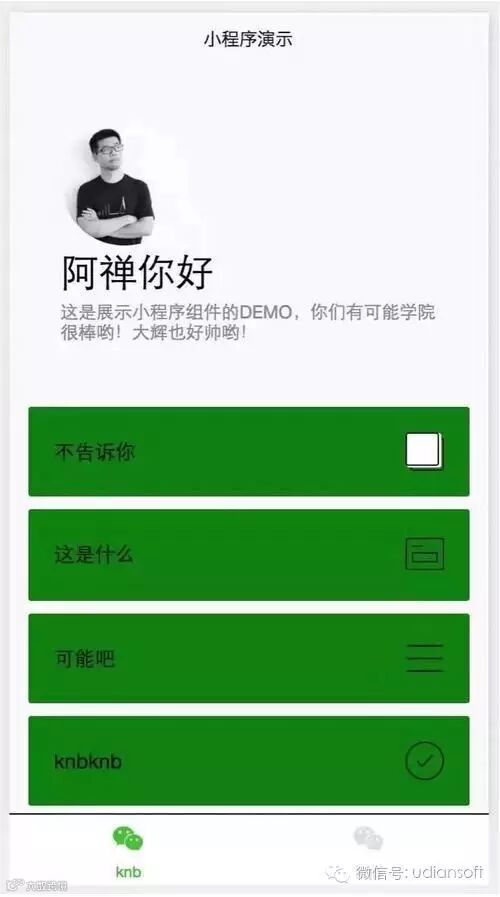 目前的”小程序“的demo演示的界面是这样的,和以往的服务号里面微网站不一样,微网站是顶部保留微信的标题栏,而应用号是全屏的。