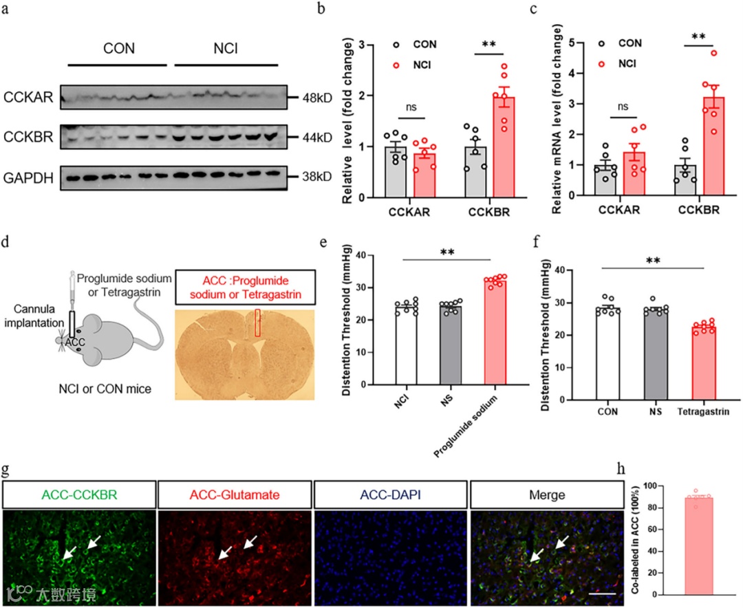 通过神经化学诱导(NCI)小鼠慢性内脏疼痛,结果显示,与对照组(CON)小鼠相比,NCI组小鼠双侧ACC区域的CCKB受体(CCKBRs)在蛋白和mRNA水平均显著升高。然而,CCKA受体(CCKARs)的蛋白和mRNA水平在任一侧ACC区域均未显著上调(图4)。