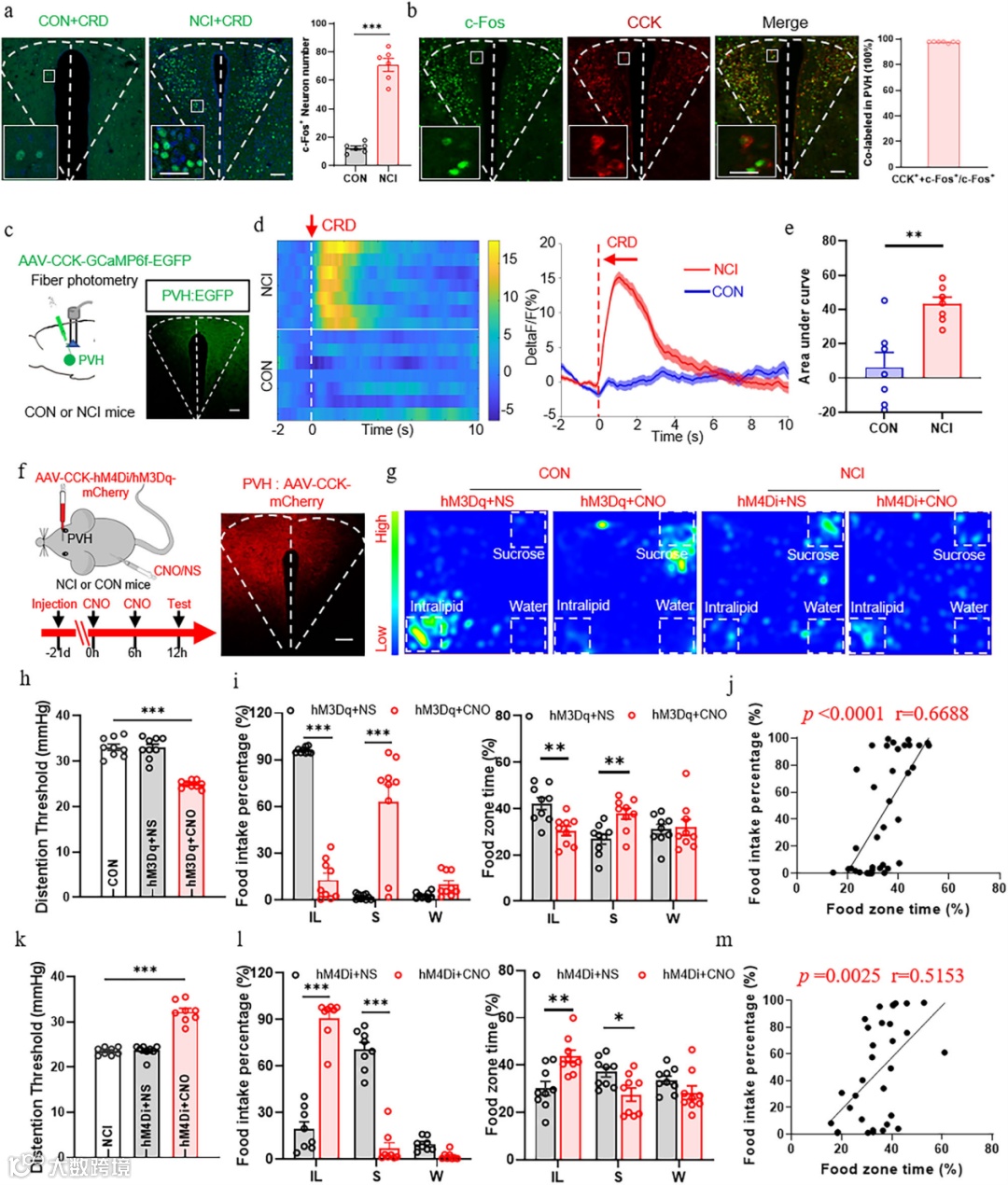 为探究PVH是否参与NCI诱导的慢性内脏高敏感性,通过比较小鼠PVH中c-Fos的表达水平,发现NCI 小鼠 PVH 中 c-Fos 表达细胞数在多次 CRD 刺激后显著增加,且多数 c-Fos 阳性神经元与 CCK 抗体共标。为阐明PVHCCK神经元在内脏疼痛感知中的功能作用,通过钙成像法,将AAV2/9-CCK-GCaMP6f-EGFP病毒注射至PVH区域,用于标记NCI组和CON组小鼠的CCK神经元。结果显示,经相同程度CRD刺激的NCI组小鼠Ca2+活性显著高于CON组。随后膜片钳技术检测发现,当施加相同电流刺激时,NCI组小鼠CCK神经元的放电频率显著高于CON组。CCK神经元的动作电位半宽和动作电位频率显著高于CON组。接下来作者将AAV2/9-CCK-hM3Dq-mCherry和AAV2/9-CCK-hM4DimCherry注射到CON小鼠和NCI小鼠的腹侧被盖区对PVHCCK神经元进行基因编辑。通过化学遗传学激活CCK神经元显著降低了CON小鼠的条件反射阈值(CRD),使食物偏好从脂质转向蔗糖;抑制则增加 NCI 小鼠 CRD 阈值,使偏好从蔗糖转向脂质。综上,PVHCCK神经元参与调节慢性内脏疼痛诱导的小鼠食物偏好变化(图2)。