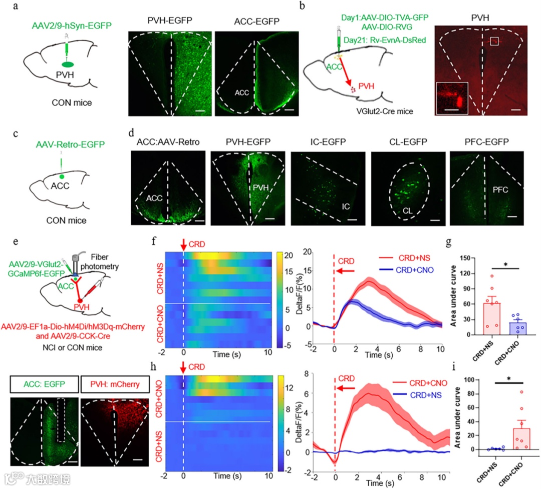 为明确PVH与VH区神经元在慢性内脏疼痛中的神经环路关系,作者首先通过将顺行示踪病毒AAV2/9-hSyn-EGFP注射至PVH区域,显示 PVH 神经元投射至 ACC。为进一步探究PVH与ACC的连接机制,作者在VGlut2-Cre小鼠中进行了基于单突触传播的狂犬病病毒逆行示踪实验,结果显示ACC的谷氨酸能神经元与PVH存在连接。为验证PVH-ACC通路,作者向ACC注射逆行示踪病毒,不仅在ACC,还在前额叶皮层、屏状核、岛叶皮层及PVH区域均观察到GFP标记信号。进一步探究ACCGlu神经元是否直接接收来自PVHCCK的投射信号。通过向PVH区域注射AAV2/9-EF1a-Dio-hM4Di/hM3Dq-mCherry和AAV2/9- CCK-Cre病毒标记CCK神经元,同时向NCI组和CON组小鼠的ACC区域注射AAV2/9-VGlut2-GCaMP6f-EGFP病毒标记Glu神经元。数据显示,在相同CRD条件下,hM4Di+CNO小鼠的Ca2+抑制水平显著低于hM4Di+NS小鼠。而hM3Dq+CNO小鼠在相同CRD刺激下的Ca2+活性则显著高于hM3Dq+NS小鼠。综上,PVH中的CCK阳性神经元可能在调节ACCGlu中起调节作用(图3)。