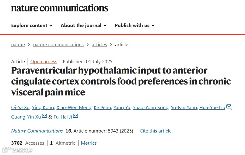 Xu QY, Kong Y, Meng XW, Peng K, Yu Y, Song SY, Yang YF, Liu HY, Xu GY, Ji FH. Paraventricular hypothalamic input to anterior cingulate cortex controls food preferences in chronic visceral pain mice. Nat Commun. 2025 Jul 1;16(1):5943. doi: 10.1038/s41467-025-61178-2. PMID: 40593837; PMCID: PMC12217335.