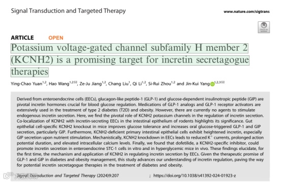 作者团队发现电压门控钾通道家族H成员2(KCNH2)钾通道在调节肠促胰岛素分泌中的关键作用。KCNH2与分泌肠促胰岛素的EECs在啮齿动物肠上皮中的共定位突出了其重要性。小鼠肠道上皮细胞特异性敲除KCNH2可改善葡萄糖耐量,增加口服葡萄糖触发的GLP-1和GIP分泌,尤其是GIP。此外,KCNH2缺陷的原代肠上皮细胞在营养刺激下表现出更高的肠促肠泌素,尤其是GIP分泌。在机制上,KCNH2在EECs中下调导致K+电流减少,动作电位持续时间延长,细胞内钙水平升高。最后,我们发现KCNH2特异性抑制剂dofetilide可以促进体外和体内高血糖小鼠肠内分泌STC-1细胞的肠促胰岛素分泌。这些发现首次阐明了KCNH2在EECs调节肠促胰岛素分泌中的作用机制及其应用。鉴于GLP-1和GIP在糖尿病和肥胖治疗中的治疗前景,本研究促进了我们对肠促胰岛素调节的理解,为潜在的肠促胰岛素促分泌疗法治疗糖尿病和肥胖提供了新依据。