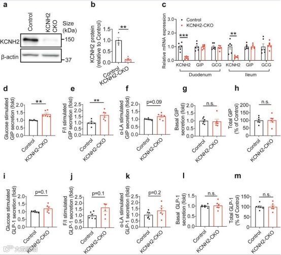 缺乏KCNH2的肠细胞表现为肠促胰岛素分泌增加。