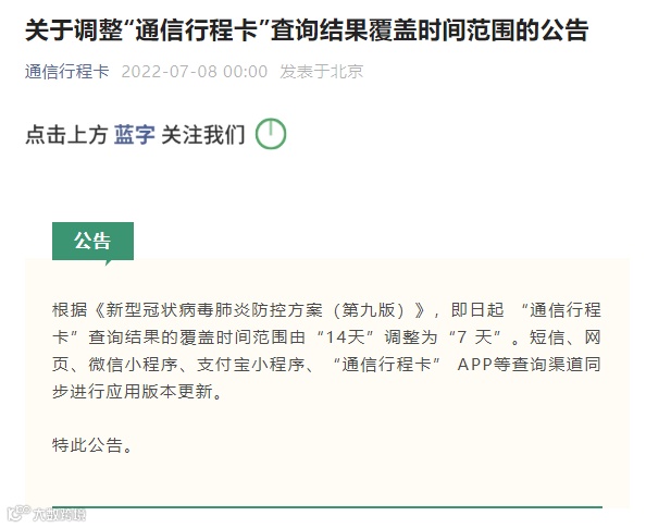 根据《新型冠状病毒肺炎防控方案(第九版)》,即日起 “通信行程卡”查询结果的覆盖时间范围由“