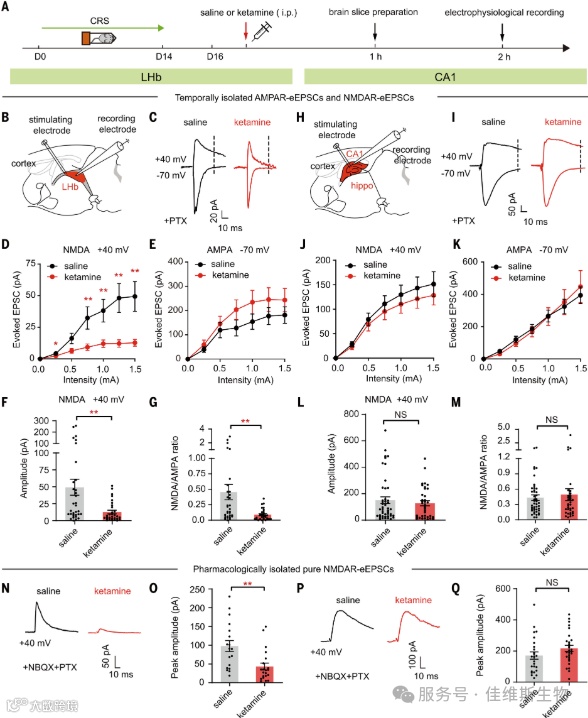 图1 抑郁小鼠全身注射氯胺酮特异性抑制 LHb 神经元中的 NMDAR 电流,但不抑制海马 CA1 锥体神经元