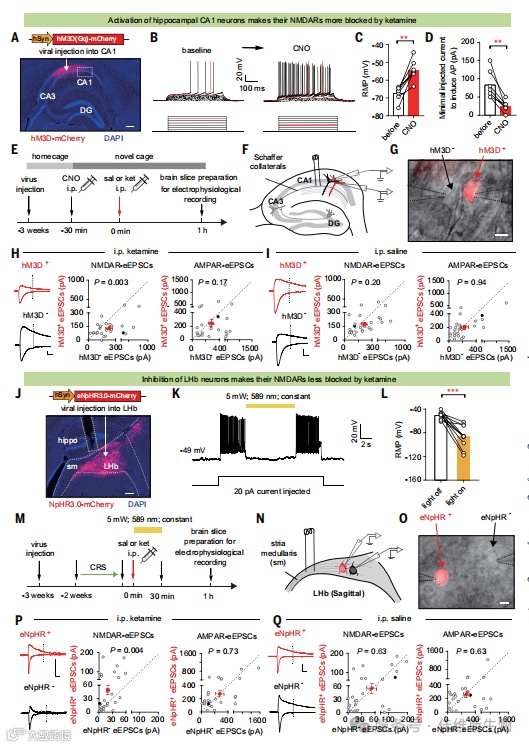 图2 CA1的激活和LHb的抑制交换了它们对氯胺酮阻断的敏感性