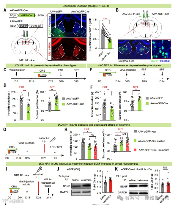上述研究结果都提示了LHb的NMDA受体是氯胺酮作用的潜在关键靶点,研究人员通过转基因品系小鼠结合病毒的方式特异性敲除LHb神经元的NR1(NMDA受体的亚基)。通过CRS抑郁模型构建后,与对照鼠相比,基因敲除小鼠(LHb-NR1-cKO)表现出抗抑郁的行为学表型。且在敲除小鼠上,氯胺酮不再具有快速抗抑郁的作用效果。该结果表明LHb的NMDA受体确实是氯胺酮抗抑郁作用的关键靶点。