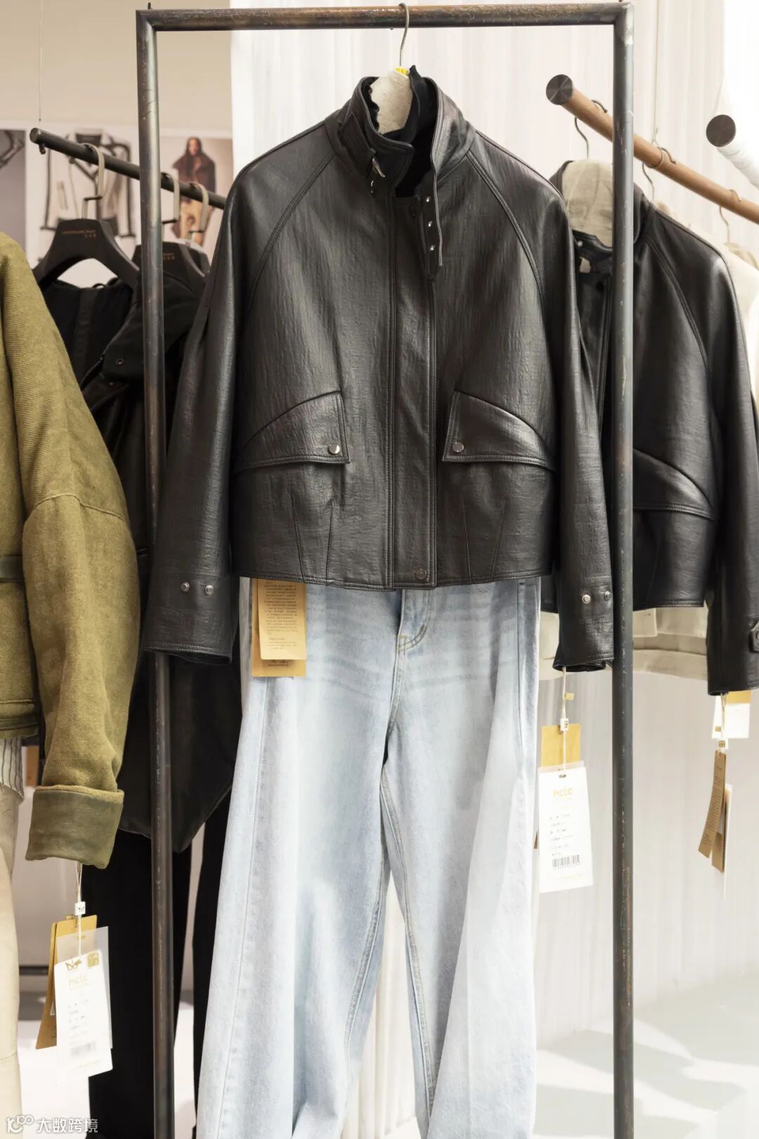 皮夹克+牛仔裤,搭配黑色细跟尖头中筒靴,时尚显瘦,随性斜挎油蜡皮托特包,掌握你的出行STYLE~还有超多皮裤、皮裙单品,任你选择!
