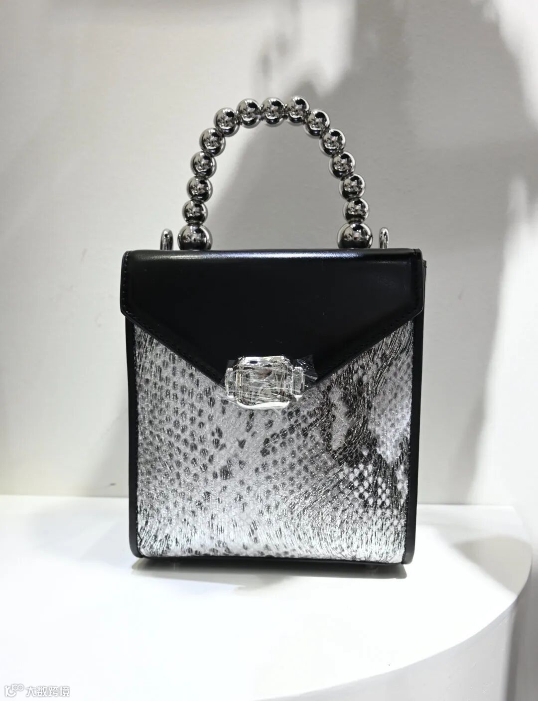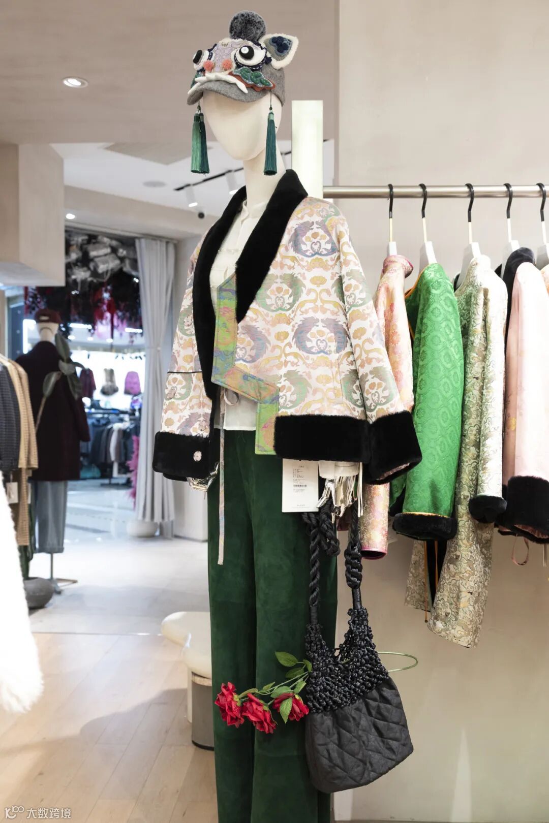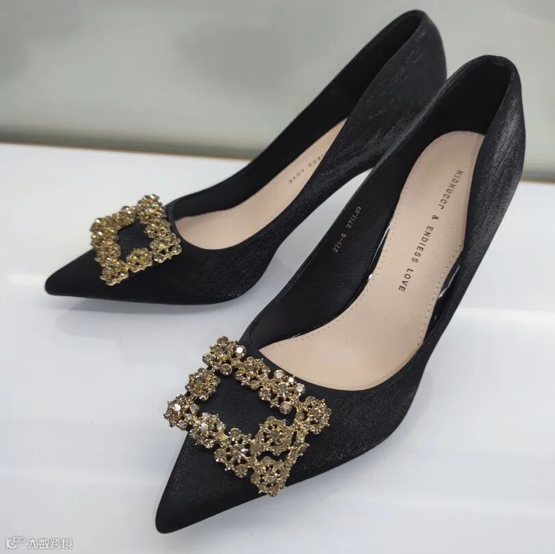 搭配同款新中式宋锦手提包,纯手工考究细节,尽显低调高级感。脚踩尖头浅口满钻高跟鞋,修饰腿部线条,仙气十足。