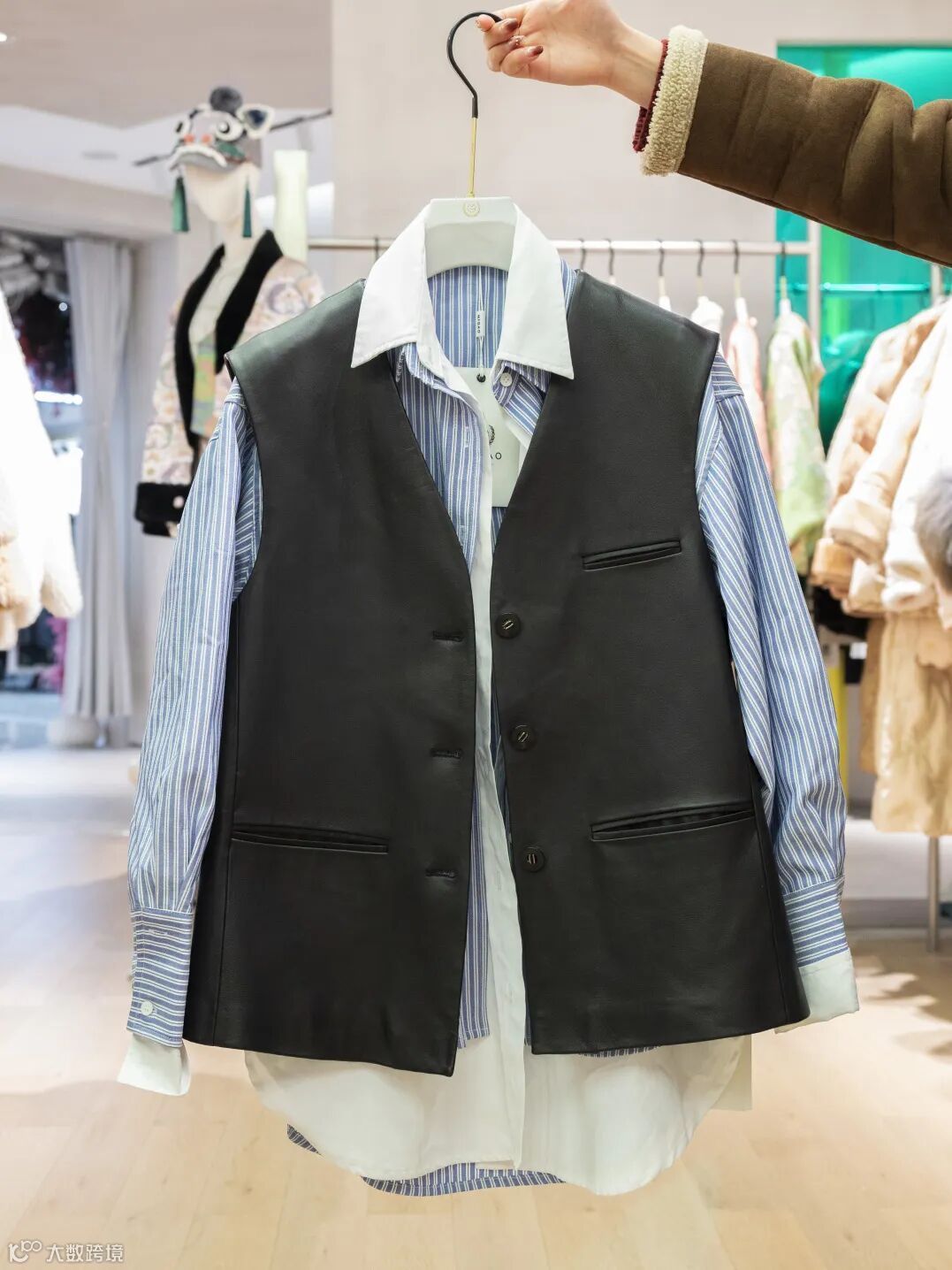蓝白条纹衬衣+黑色皮马甲