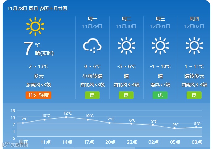 12月2日:晴转多云 西南风3—4级 11℃~1℃