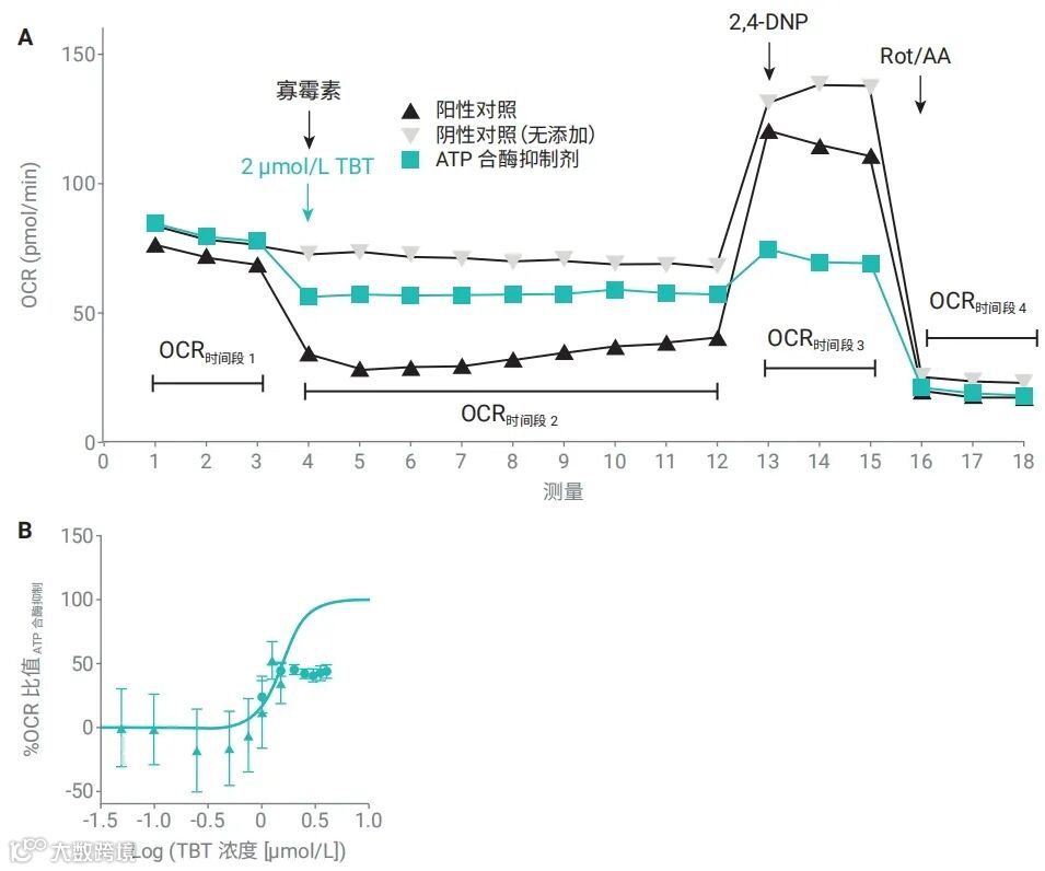 图 3. (A) HepG2 细胞中 ATP 合酶抑制的 OCR 时间曲线。阳性对照(加入寡霉素,然后加入 2,4-DNP,接着加入 Rot/AA)的 OCR 曲线为黑色向上的三角形。阴性对照的 OCR 曲线为向下的空三角形。充当 ATP 合酶抑制剂的样品(2 µmol/L 三丁基锡,TBT)为绿色方块。(B) ATP 合酶抑制剂 TBT 的浓度-响应曲线。3 个较高浓度下化合物过量,浓度-响应曲线中排除了这三个浓度(公式 2)