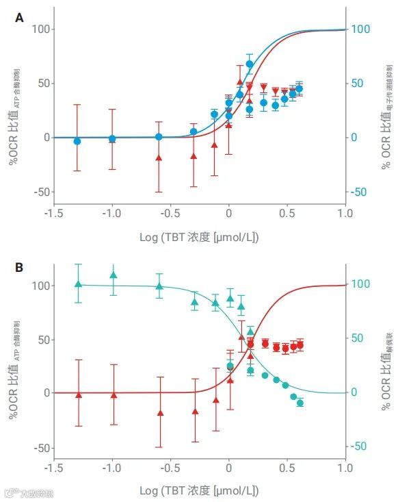 图 6. (A) TBT 的 ATP 合酶抑制(左侧 Y 轴,红色三角形)与电子传递链抑制(右侧 Y 轴,蓝色圆)的浓度-响应曲线。(B) TBT 的 ATP 合酶抑制(左侧 Y 轴,红色三角形和圆形,不同符号表示独立实验)与解偶联效应(右侧 Y 轴,蓝绿色三角形和圆形,不同符号表示独立实验)的浓度-响应曲线的比较