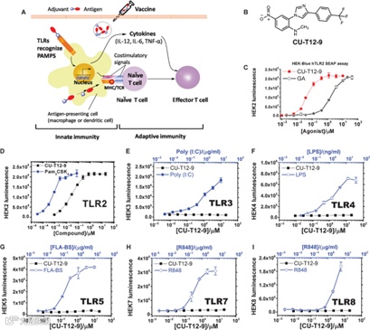 CU-T12-9(AbMole,M11026)是一种高选择性的Toll样受体1/2(TLR1/2)异二聚体的激动剂,其EC50值为52.9 nM,对TLR1/2异二聚体具有高度特异性,而对TLR2/6没有明显作用。在细胞实验中,CU-T12-9(CAS No.:1821387-73-8)通过与TLR1和TLR2结合,促进TLR1/2异二聚体复合物的形成,进而激活NF-κB信号通路,诱导下游效应分子TNF-α、IL-10和iNOS的表达[24]。在动物实验中,CU-T12-9可同时激活先天免疫系统和适应性免疫系统,提高机体的免疫反应。