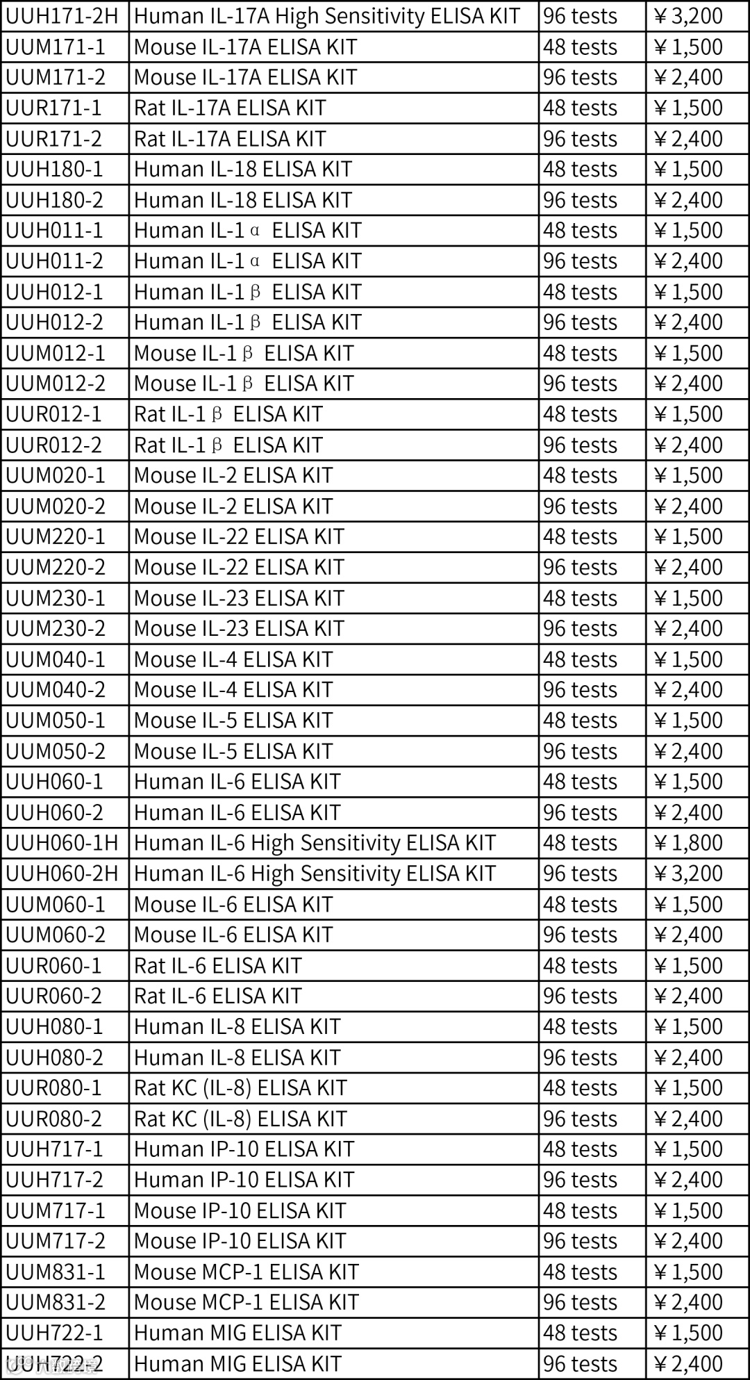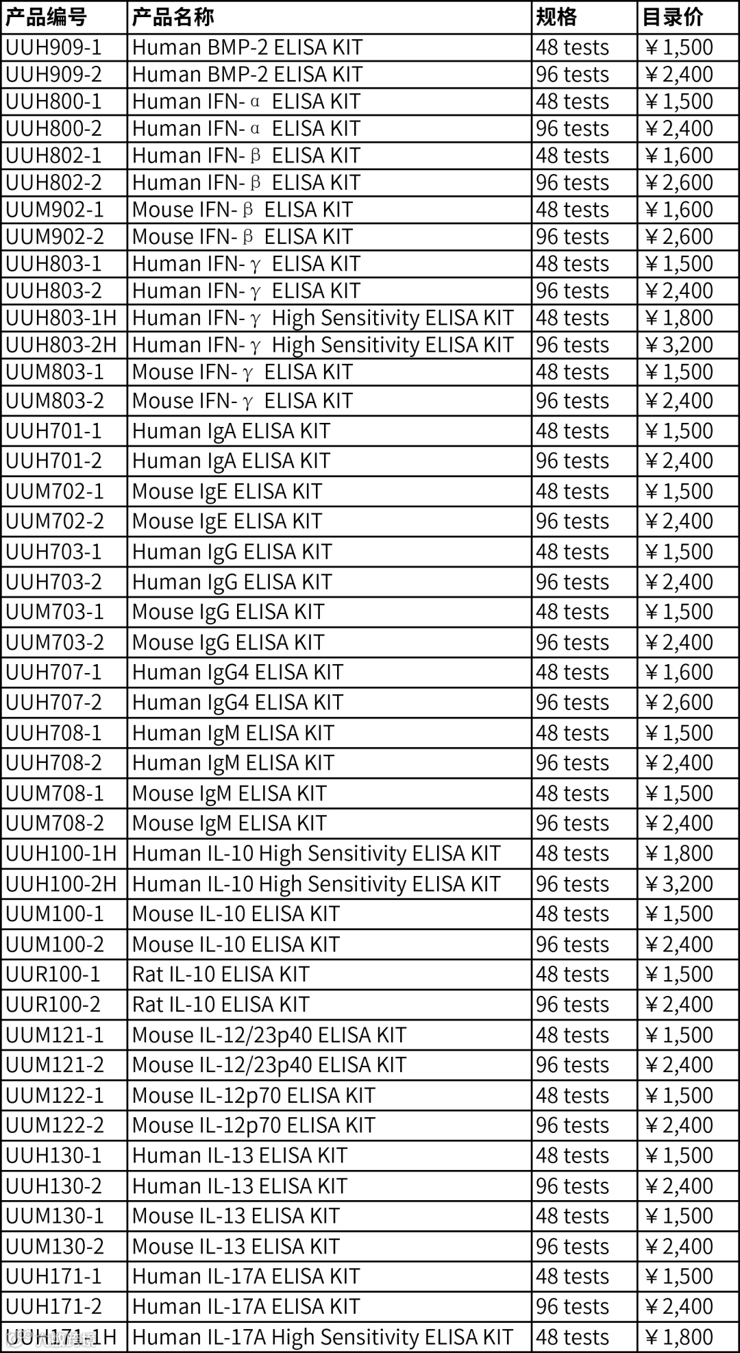 UUBIO ELISA试剂盒查询列表
