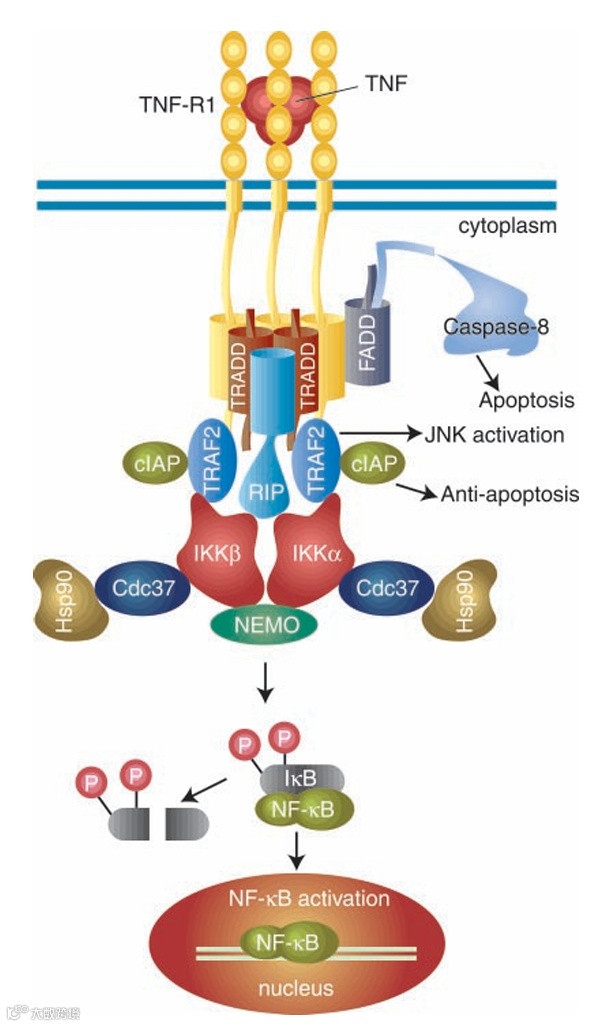 TNFR1 是大多数TNF效应的主要介导者,可触发NF-κB活化、MAPK信号传导、凋亡和坏死性凋亡。