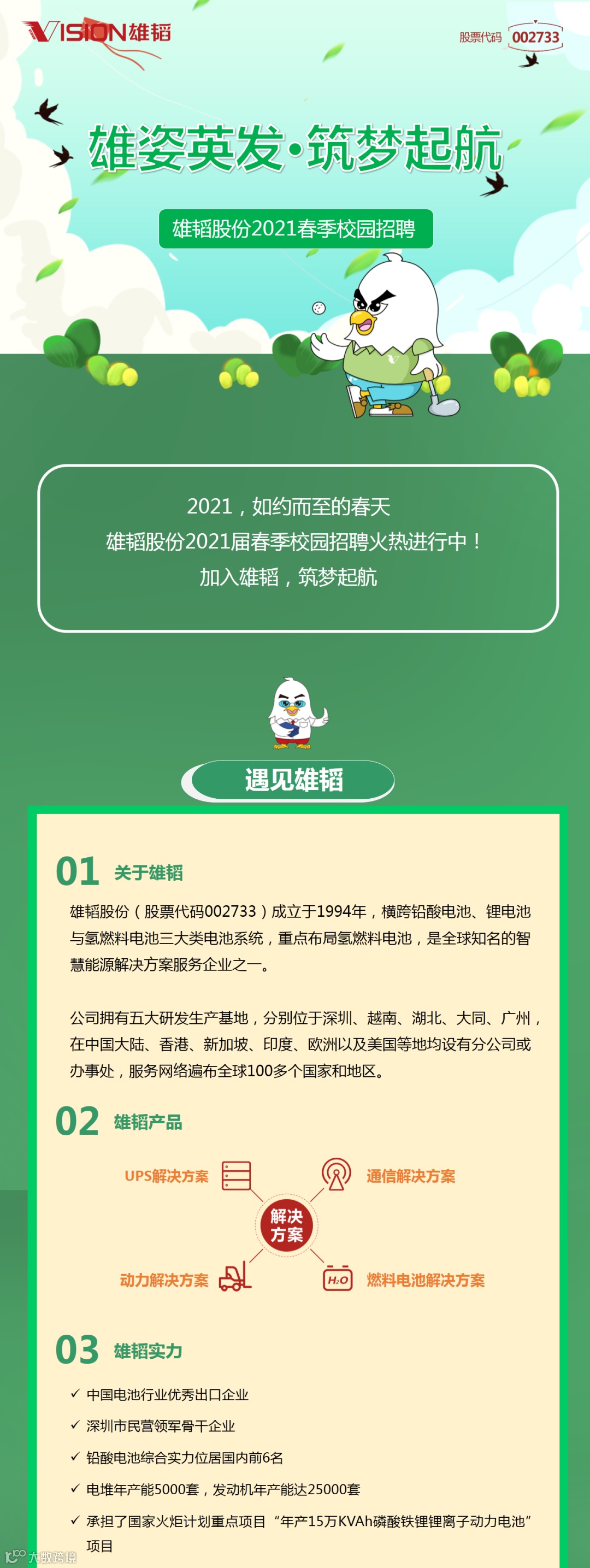 深圳市雄韬电源科技股份有限公司(股票代码002733),全球知名的智慧能源解决方案服务企业之一。公司拥有五大研发生产基地,分别位于深圳、越南、湖北、大同及广州,在中国大陆、香港、新加坡、印度、欧洲以及美国等地均设有分公司或办事处,服务网络遍布全球100多个国家和地区。
